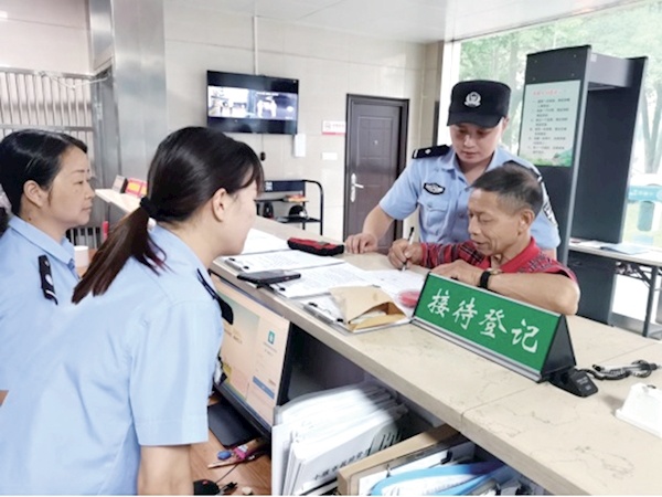花果派出所民警指导刘道理(右)在市社会救助站办理交接手续。