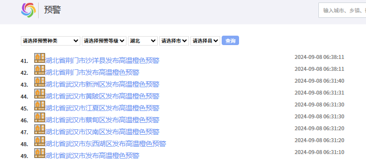武汉市气象台2024年09月08日06时31分发布高温橙色预警信号:预计今天白天,武汉大部街道(乡镇)最高气温将升至37℃以上,局地可达39℃以上。此外,襄阳、仙桃、潜江、随州等地的高温预警也在继续生效中,请加强防范。
