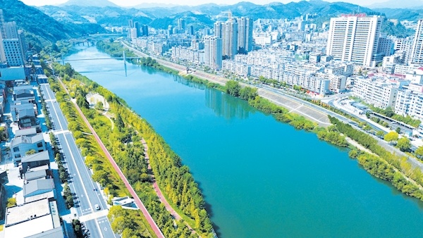 9月5日,记者航拍的堵河竹山县城段。从高空俯瞰,穿城而过的堵河像一条玉带系在县城腰间,一幅美丽的生态画卷呈现在眼前。堵河流经竹山县,是汉江的重要支流,堵河水质直接关系丹江口库区水质。近年来,竹山县综合治理辖内堵河流域,认真落实“河湖长制”,修复水生态,保护水环境,塑造了“河畅、水清、岸绿”的美景,确保一泓清水永续北上。特约记者杨显有摄