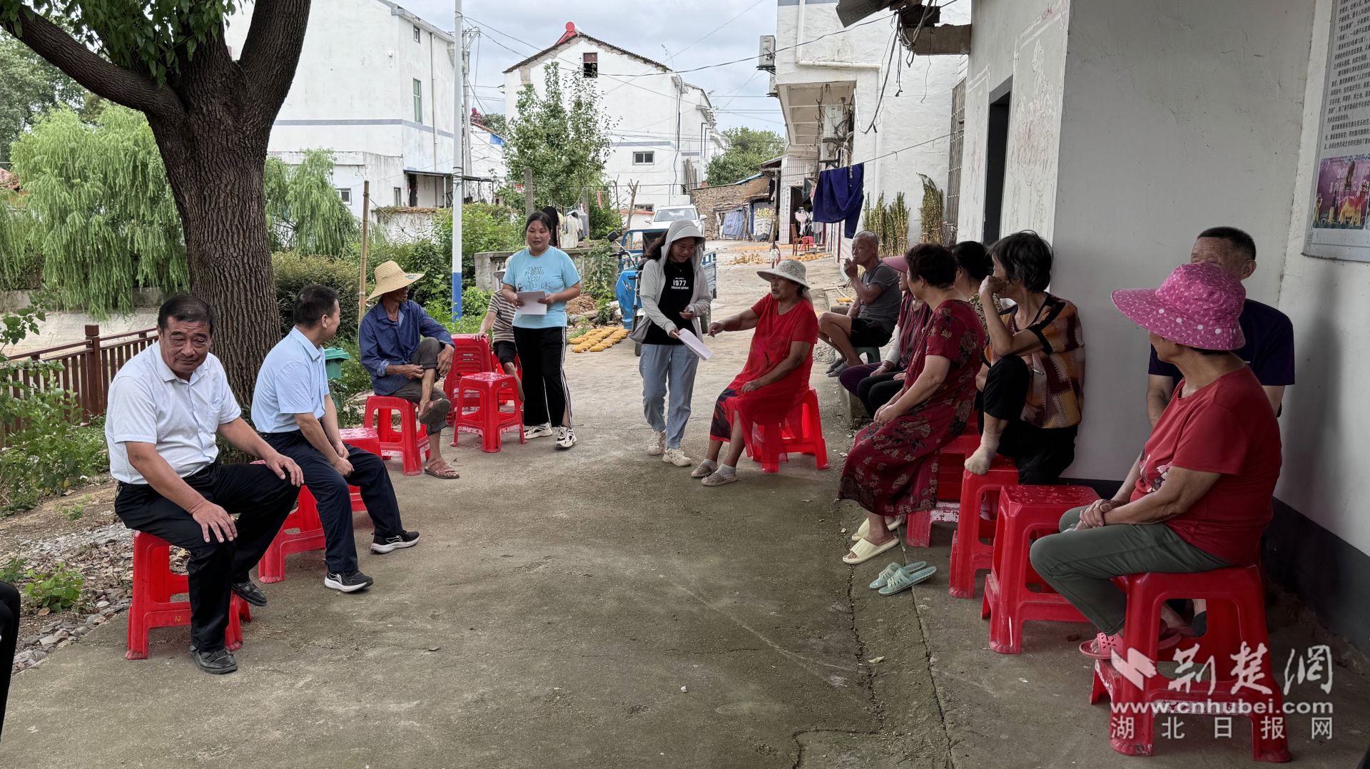 村委会旁,屋场院子会正在进行,干部、群众围坐在一起,填写调查问卷。