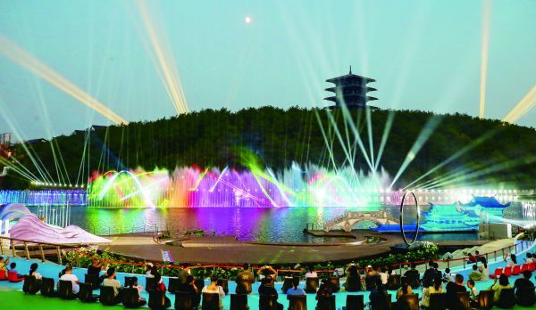 9月15日,荆门园博园的音乐喷泉秀吸引了众多市民观看。中秋小长假,秋风送爽,正是出门游玩的好时节,我市不少景点推出了丰富多彩的节目吸引游客。(记者 郑波 摄)