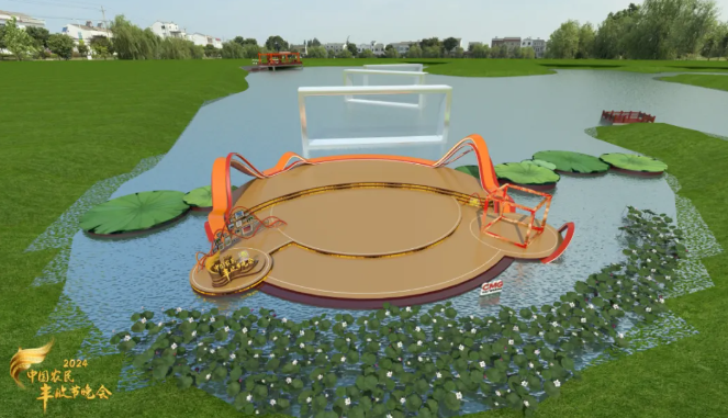2024年总台丰晚主会场落地湖北省仙桃市,这里地处江汉平原腹地,水土丰饶,素有“鄂中宝地 江汉明珠”之称,是有名的“鱼米之乡”。主舞台设在“中华养鳝第一村”先锋村,主创团队因地制宜,将主舞台巧妙建于村居一畔的水塘之上,两侧以荷叶造型搭起长廊步道,除了舞台之外还是小型活动广场。舞台四周绿意盎然,导播台背后,就是连片的黄鳝养殖基地规模化水箱,别有一番景象。
