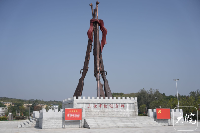 大皖新闻讯 巍巍大别山,英雄乘马岗。在湖北省麻城市乘马岗镇一片宽阔的广场上,四支铜塑的老式步枪以“红丝带”环绕、互相倚靠,直冲云霄,在初秋的阳光下熠熠生辉。