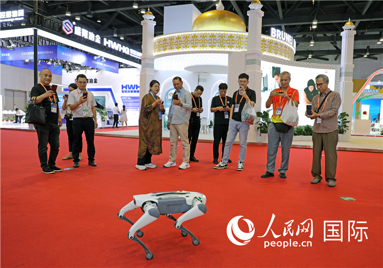 东博会上,观众正在参观一只机器狗。绿色能源、新能源汽车、绿色农产品等成为本届东博会观众关注的焦点。人民网记者 赵益普摄