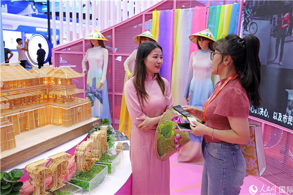 参观者在东博会越南展区同工作人员咨询交谈。人民网记者 赵益普摄