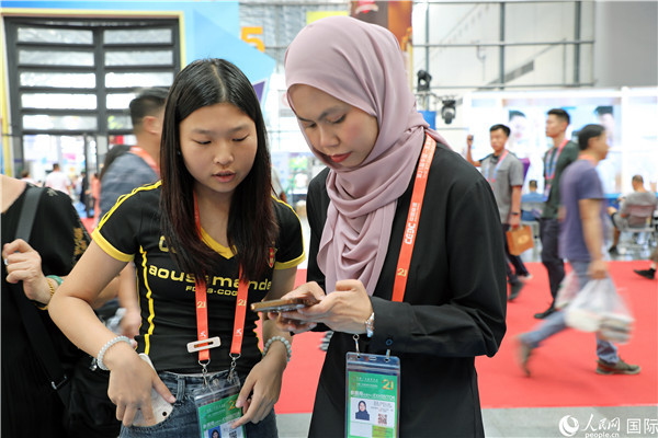 东博会现场,马来西亚展商在同中方工作人员交谈。人民网记者 赵益普摄
