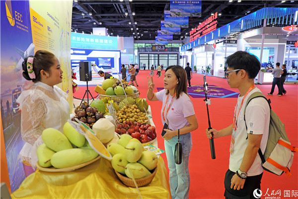在东博会泰国展区,参观者在向泰方工作人员了解泰国水果情况。人民网记者 赵益普摄