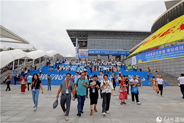 第二十一届东博会展馆外,参观者步行离场。人民网记者 赵益普摄