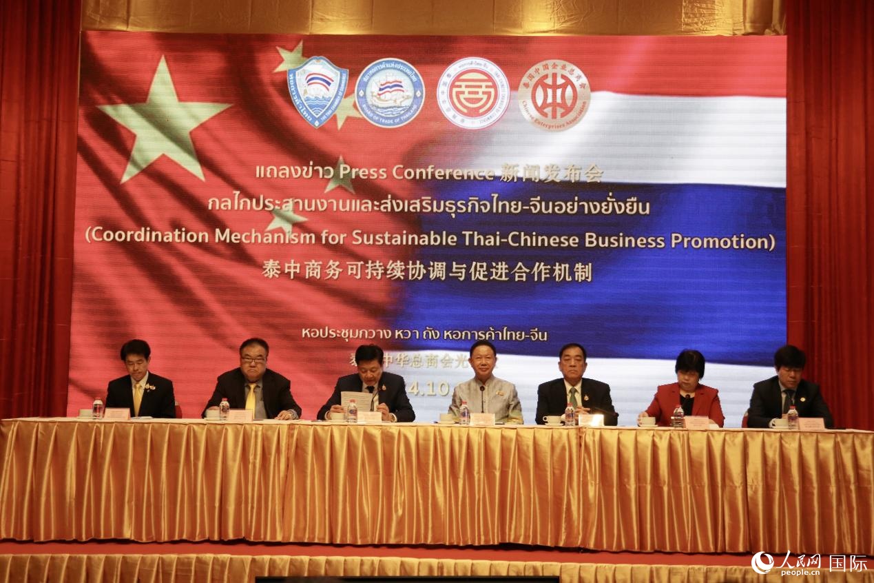 人民网曼谷10月9日电 (记者章念生、实习生姚欣可)10月9日,泰国商会暨泰国贸易院、泰国中华总商会、泰国中国企业总商会在泰国曼谷共同宣布成立“泰中商务可持续协调与促进合作机制”。泰国商会暨泰国贸易院主席洪百川、泰国商业总会第一副主席陈培强、泰国中华总商会主席林楚钦、泰国中国企业总商会理事会主席陈华等嘉宾出席新闻发布会并发表致辞。