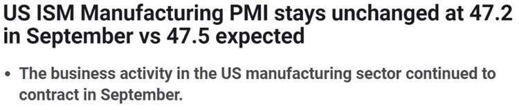 美国供应管理学会公布的最新数据显示,美国9月制造业采购经理指数(PMI)为47.2,继续低于50这一荣枯分界线,表现不及市场预期。