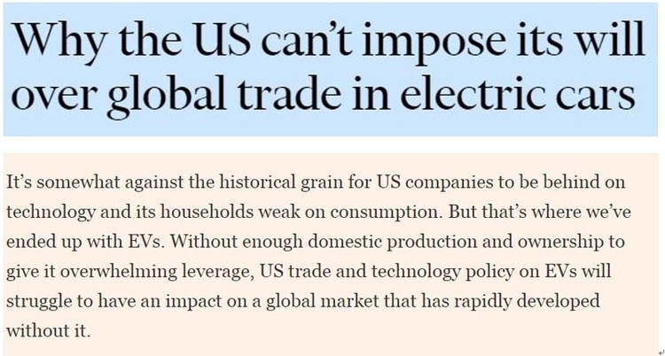比如,美国政府现在想全面禁止在美销售的电动汽车使用别国软件,并寻求盟友支持,但因其自身经济基础不坚实,所以难以对他国产生决定性影响。