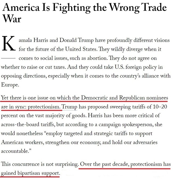 美国《外交》杂志发表题为《美国打错了贸易战》的文章指出,尽管美国两党的总统候选人哈里斯和特朗普在很多问题上的立场大相径庭,但却在实行保护主义问题上有着相似的态度。