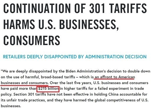 美国零售业领导者协会负责国际贸易的副主席布莱克·哈登就曾发表文章,批评拜登政府决定延续301关税的做法是“对美国企业和消费者的侮辱”。