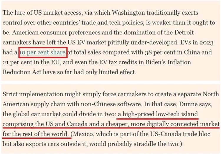 文章指出,美国自己的电动汽车市场一直处于欠发达状态,2023年电动汽车仅占到美国汽车总销量的10%左右,远低于世界其他主要地区。即便是《通胀削减法案》中的电动汽车税收抵免政策,到目前为止的效果也极其有限。