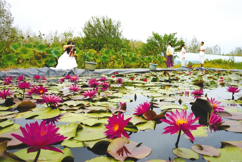 就这样,王磊通过不断引进国内外新品种和杂交育种,每年选育出上十个新品种,经过2至3年的试种,结合市场反响,不断优化调整种植规模,目前基地共种植引进和自育荷花、睡莲品种达到50多个。