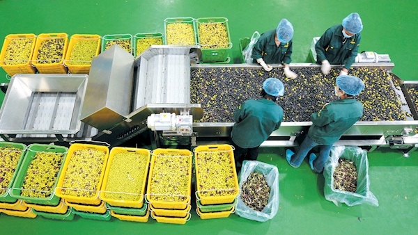 10月23日,在位于郧阳区的湖北鑫榄源油橄榄科技有限公司压榨车间,一颗颗圆润饱满的油橄榄鲜果被传送到自动化生产线上,经过筛选、清洗、融合压榨、果渣和油水分离等工序后,变成黄绿色的橄榄油。眼下,郧阳区各地种植的油橄榄进入采摘期,农户加紧采摘,企业抓紧开榨。近年来,该区按照种植规模化、管理规范化、产销一体化的“公司+基地+农户”运营模式,大力发展油橄榄产业,带动农户增收。目前,全区油橄榄种植面积6.2万余亩,形成集种苗繁育、生态种植、精深加工、产品开发于一体的产业链,已经推出油橄榄“食”字号、“健”字号、“妆”字号等3大类35款产品。特约记者曹忠宏摄