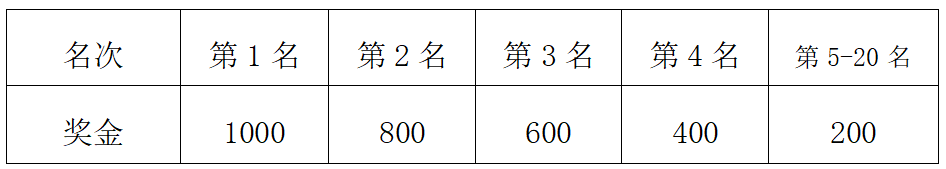 分男子组和女子组,男子组和女子组前3名分别授予奖杯,前 20 名运动员分别获得奖金(奖金见下表,单位:元),凡参加比赛的运动员均获得赛事奖牌。