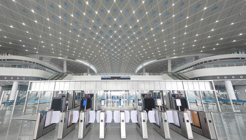 连日来,随着荆荆高铁线路正式通车进入倒计时,荆门西站相关建设也在有序推进,一批批站内设施设备陆续上新。据中铁建工集团相关负责人介绍,荆门西站现已基本完成金属屋面、外立面幕墙及室内装饰装修工作,站内零星标识标牌安装、旅客12306服务台安装、室外落客平台收尾工作正在进行。图为拍摄的候车大厅进站口实景。(记者张彩云 摄)