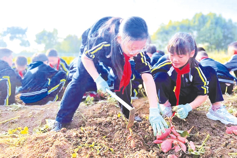 近日,曾都区五丰学校小学部劳动课在“五谷丰登园”开课,学生们下地挖红薯,体会劳动的意义,体验收获的喜悦。 (随州日报通讯员 邹圣美 黄舒娣摄)