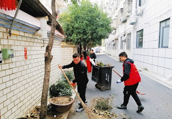 10月29日,广水市应山街道三里塘社区组织“百日行动”志愿服务队开展环境卫生整治工作。党员、志愿者身穿红马甲,来到小区楼道、房前屋后,清扫垃圾杂物。(随州日报通讯员高晓涵、蔡超摄)