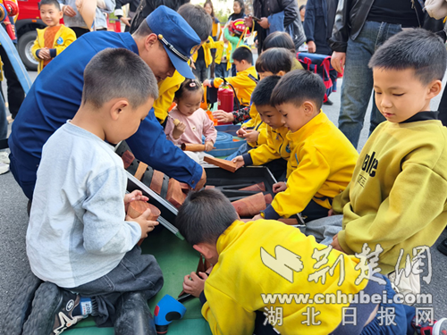 消防宣传员带领小朋友体验消防器材。通讯员 供图