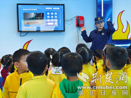 消防宣传员带领小朋友体验119模拟报警系统。通讯员 供图