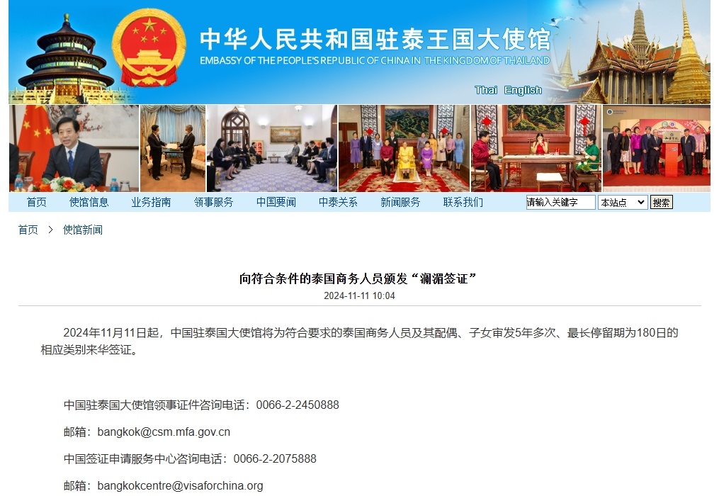央视网消息:据中国驻泰国大使馆消息,2024年11月11日起,中国驻泰国大使馆将为符合要求的泰国商务人员及其配偶、子女审发5年多次、最长停留期为180日的相应类别来华签证。