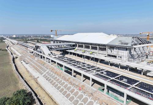 连日来,由中铁建工集团承建的沪渝蓉高速铁路武宜段钟祥南站站房,正在进行装饰装修施工,其中,金属屋面构造层已全面完成,准备进行面板施工;玻璃幕墙和室内外装修基层骨架完成,正在进行面层施工;站台的主体结构已全部完成。