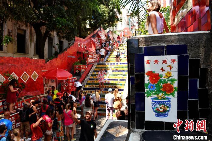 跟随里约热内卢共和国博物馆研究员安德烈·安迪·安古洛,中新社记者来到里约热内卢闻名遐迩的城市地标——塞拉隆阶梯。这是由智利艺术家塞拉隆历时20余年打造的“彩色阶梯”。