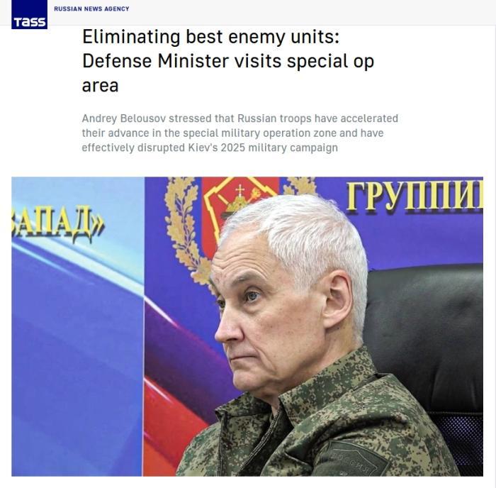 据报道,别洛乌索夫在视察特别军事行动区时表示,俄军加快了在特别军事行动区的进攻速度,乌军拟在2025年进行的行动已被打断。他还称,乌军“最强的部队已被歼灭”。