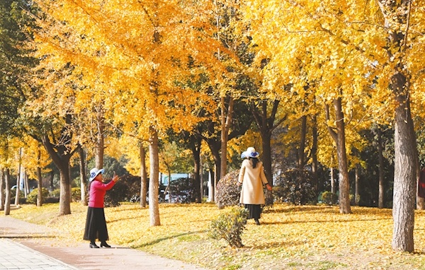 初冬时节,随州城区层林尽染,银杏树叶纷纷飘零,给大地铺上一层金黄,成为一道靓丽景观,吸引众多市民游赏拍照。为挽留美景,市城管执法委园林绿化部门推出“落叶缓清扫”举措,让市民更好地领略城市美丽。图为市民在白云湖大坝口袋公园游玩留影。(随州日报通讯员聂少峰摄)
