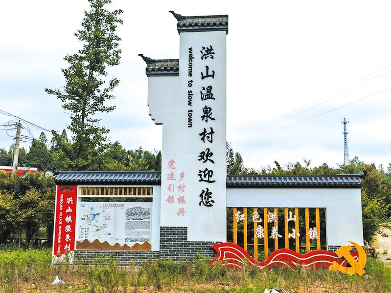在温泉村入口处,一个大蜗牛塑像格外引人注目,寓意着“悠闲慢生活”的大蜗牛与“洪山温泉慢养小镇”标志交相辉映。