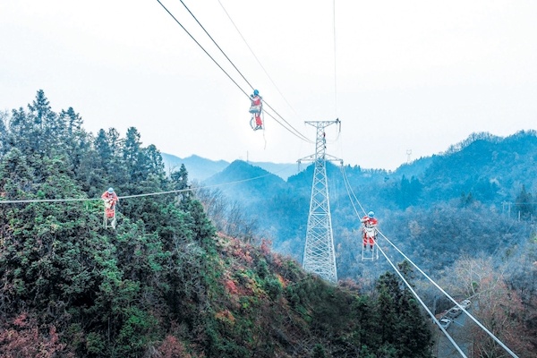 12月3日,国网十堰供电公司施工人员在220千伏十房线N17至N18号铁塔间的导线上安装间隔棒,提升线路抗冰防舞能力。据悉,输电线路覆冰时在风的作用下会产生舞动现象,加装间隔棒能够有效抑制线路的舞动,特别是在雨雪冰冻天气线路覆冰后,能避免导线脱冰跳跃及导线弧垂增加所造成的线路跳闸。连日来,该公司利用晴好天气,抓紧对易覆冰地段输电线路进行改造升级,确保电网安全度冬。通讯员郝金鑫摄