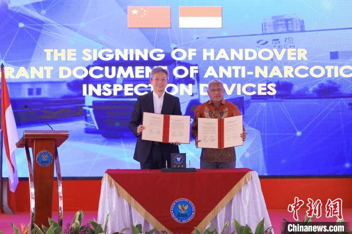 中国驻印尼大使王鲁彤和印尼国家禁毒委员会主席马蒂努斯分别代表中印尼两国政府签署设备交接证书。中新社记者 李志全 摄