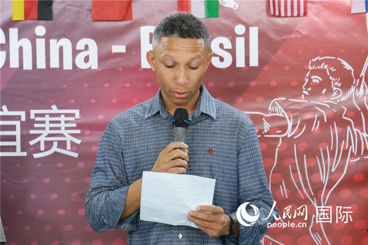 巴西羽毛球文化协会主席亚历山大·奥利维拉在决赛开幕式致辞。人民网记者 陈海琪摄