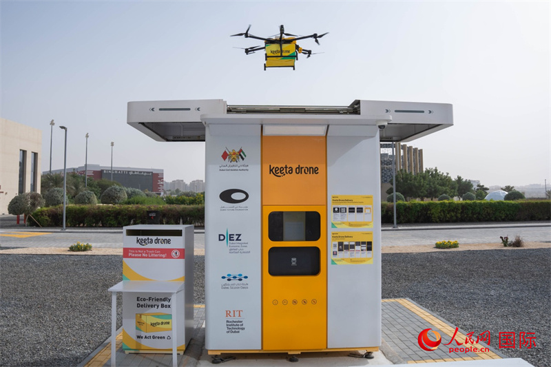 在当天举行的无人机配送演示活动上,只见工作人员打开手机外卖软件,挑选好餐品后选择无人机送货地点,大约十分钟的时间后,低沉稳定的嗡嗡声传来,携带外卖盒的无人机缓缓降落到位于罗彻斯特理工学院迪拜分校的外卖柜。输入验证码,取出外卖盒,热腾腾的美食出现在面前。