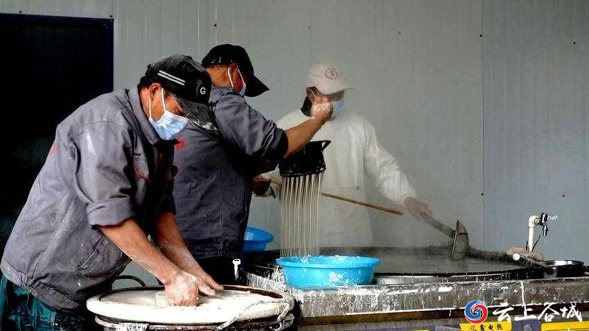 打粉、磨浆、过滤、捞粉、冷却、上挂……生产线上工人们忙碌不停,一道道工序有条不紊,一排排粉条高挂下垂,空气中弥漫着红薯蒸煮后特有的香甜。