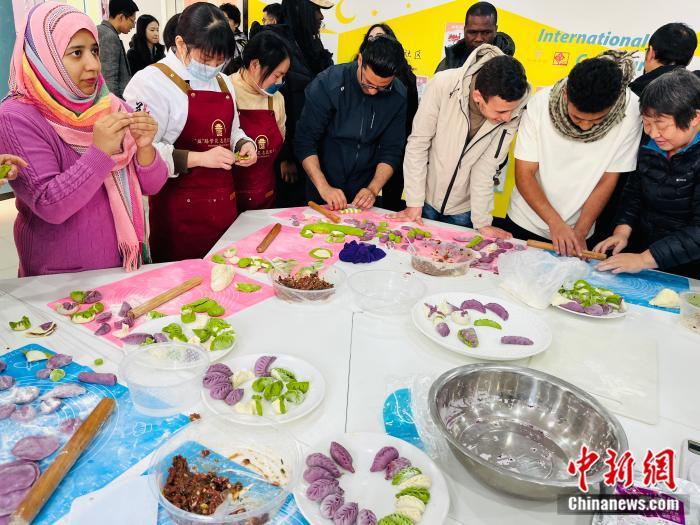 义乌鸡鸣山社区组织中外居民包饺子活动。(中新网 赵丽 摄)
