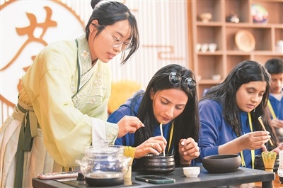 2024年4月15日,2024年“汉语桥”上海合作组织国家青年学生春令营开营仪式在新疆师范大学举行。来自8个上合组织国家的近500名青年学生参加了此次春令营。图为参加春令营的来华青年学生在新疆师范大学学生(左)的指导下学习茶艺。