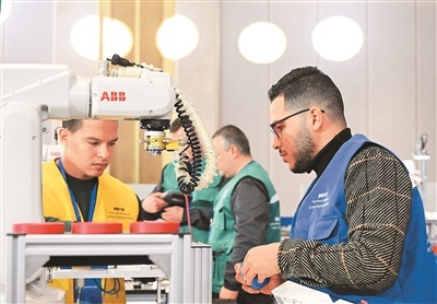 2024年12月18日,第三届上合组织国家职工技能大赛在青岛市开幕。图为来自埃及的易卜拉欣·穆西·赫尔米·穆西(前右)与穆斯塔法·霍斯尼·穆斯塔法·梅特瓦利(前左)在工业机器人操作调整工项目比赛中。