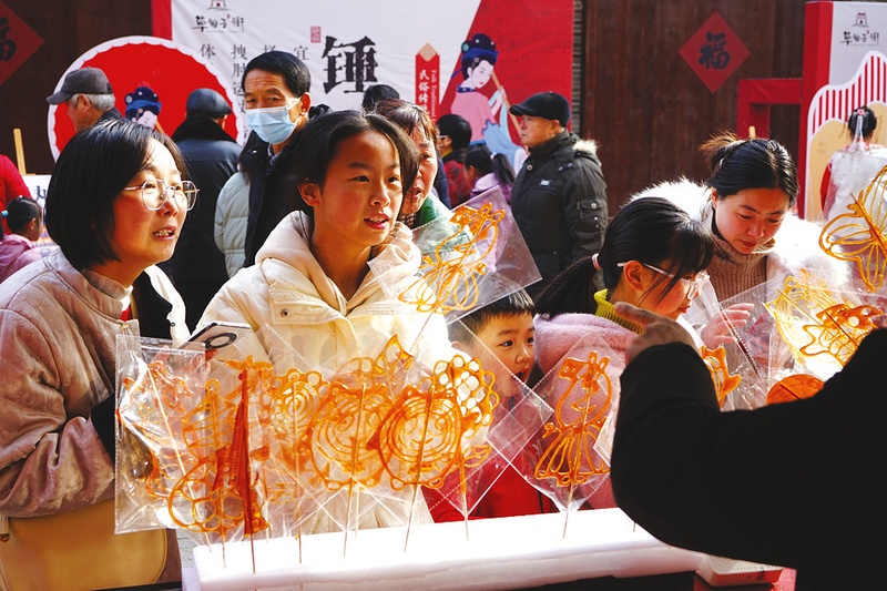 现场活动丰富多元,街道两边传统手艺人现场展示着剪纸、糖画、竹雕、根雕等精妙技艺,游客们拿着集章手册体验射箭、投壶、蹴鞠等传统活动,还有书法家们现场挥毫泼墨,免费赠予新春对联,让游客们体验到民俗的独特魅力,感受城市深厚的文化底蕴。