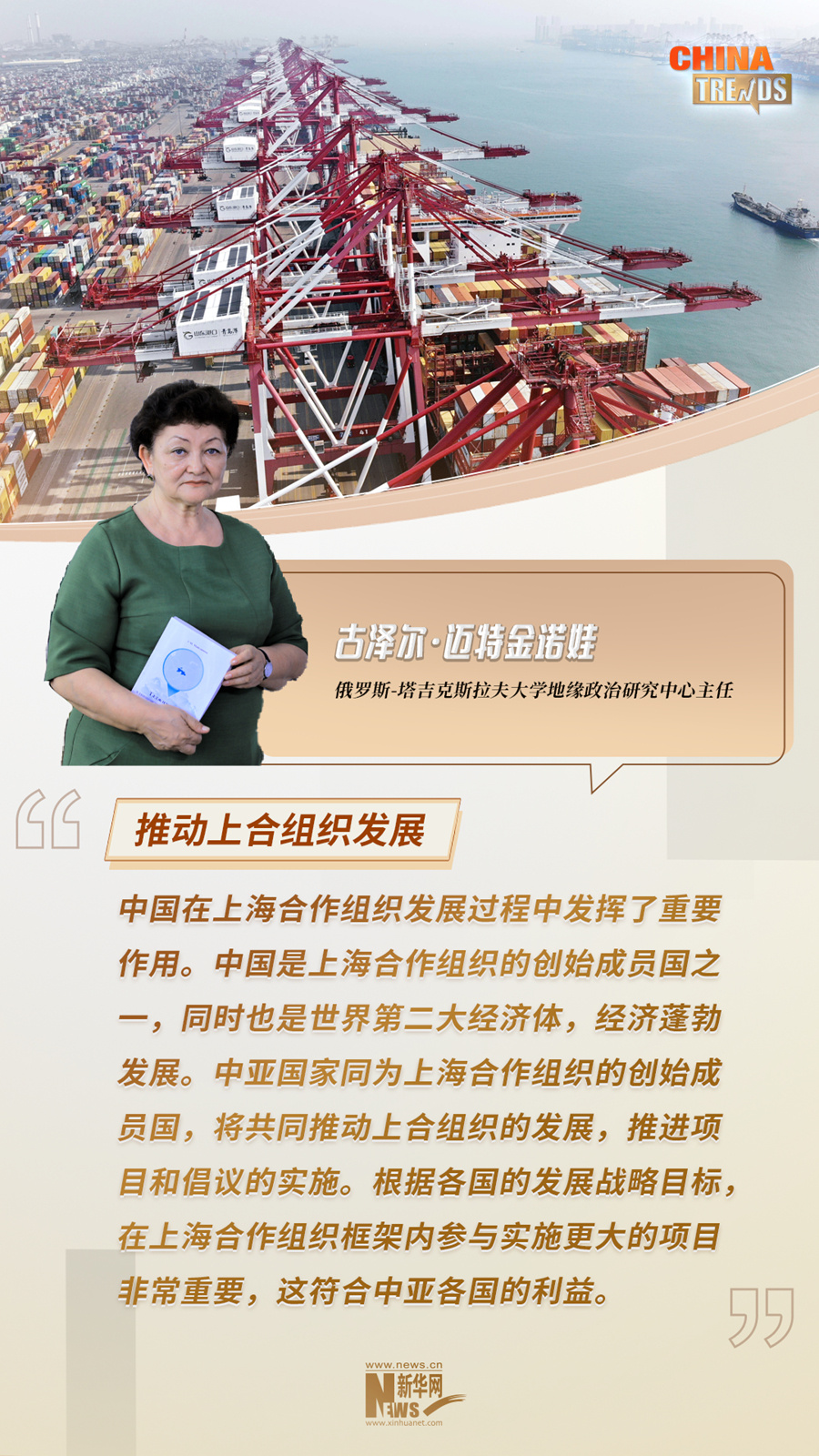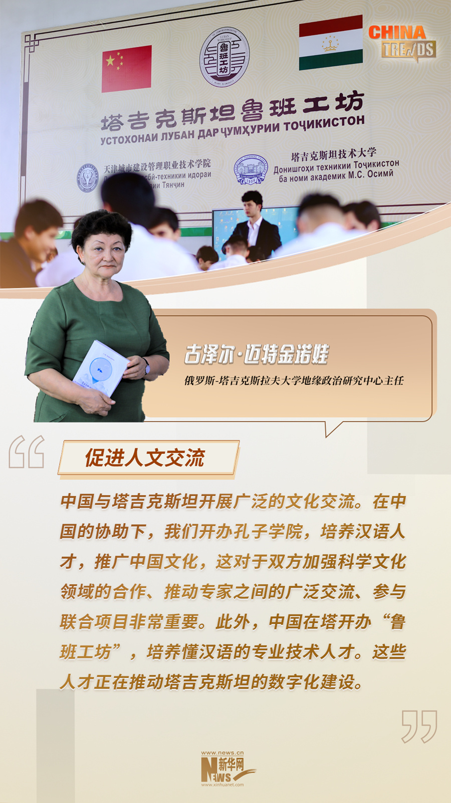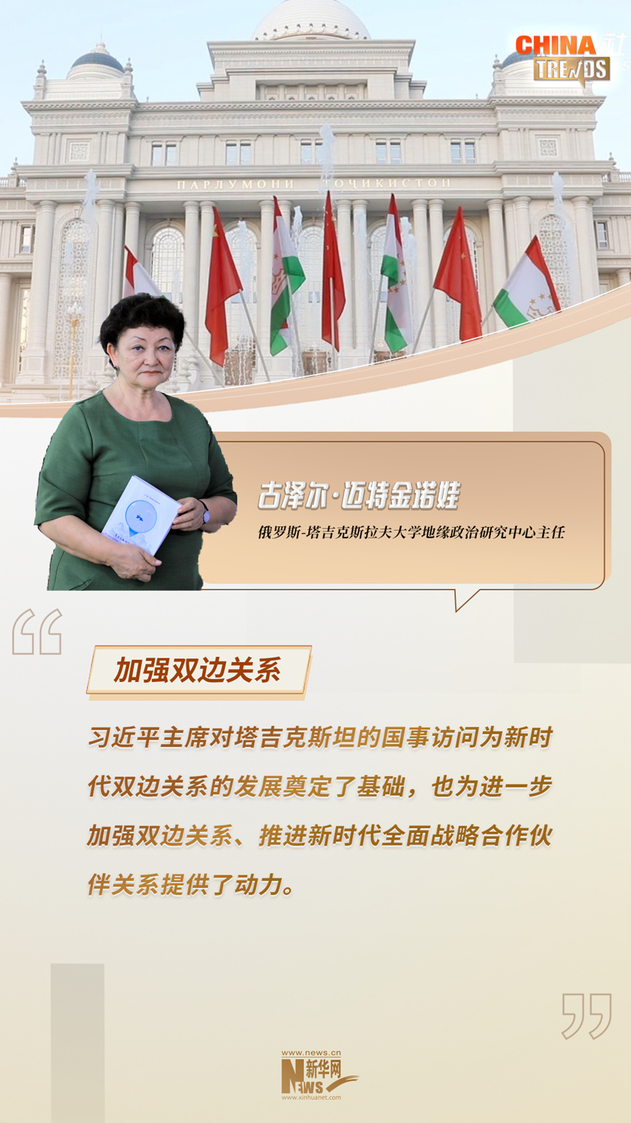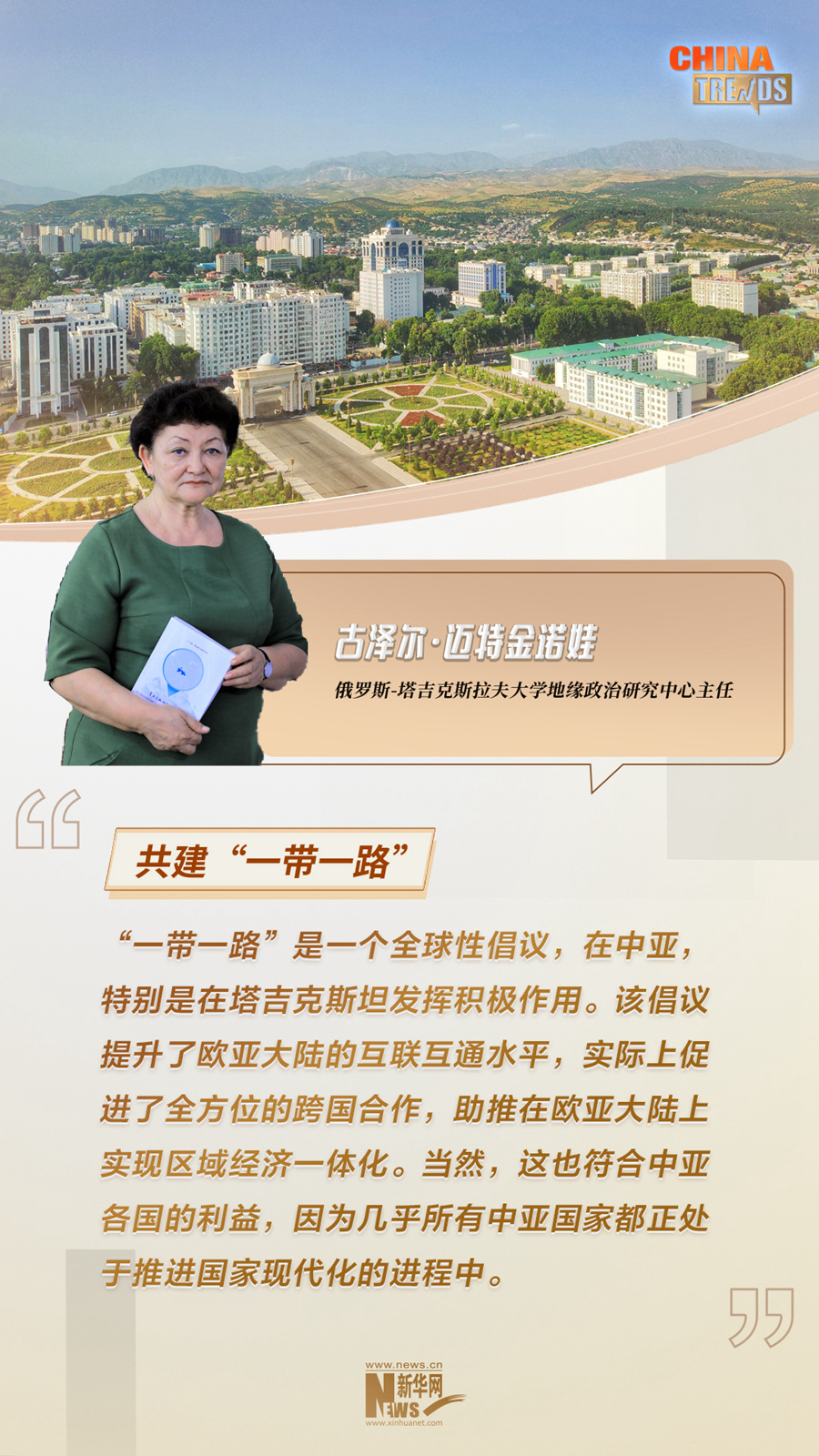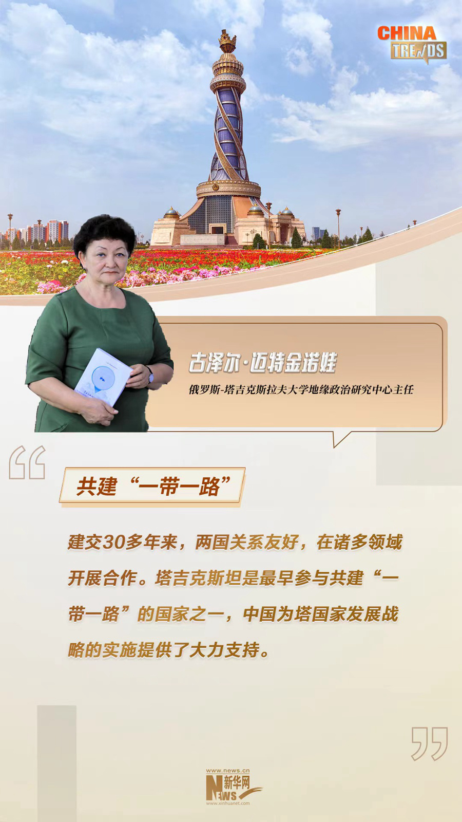 俄罗斯-塔吉克斯拉夫大学地缘政治研究中心主任古泽尔·迈特金诺娃日前在接受新华网采访时表示,作为最早参与共建“一带一路”的国家之一,塔吉克斯坦同中国关系的发展是目前中亚地区与中国开展紧密合作的标志之一。通过共建“一带一路”合作,中国为包括塔吉克斯坦在内的中亚国家现代化进程给予了大力支持和帮助。