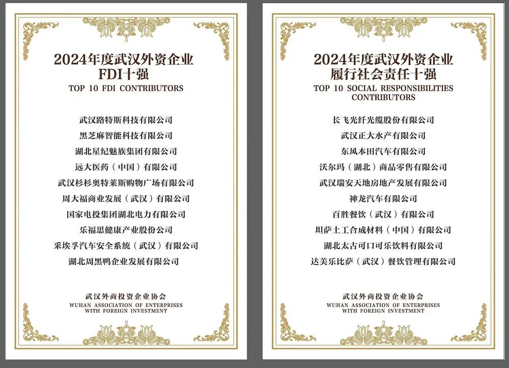 武汉路特斯科技有限公司、周大福商业发展(武汉)有限公司、湖北星纪魅族集团有限公司等企业上榜2024年度武汉外资企业“FDI十强”,长飞光纤光缆股份有限公司、武汉瑞安天地房地产发展有限公司、沃尔玛(湖北)商务零售有限公司等企业,上榜2024年度武汉外资企业“履行社会责任十强”。