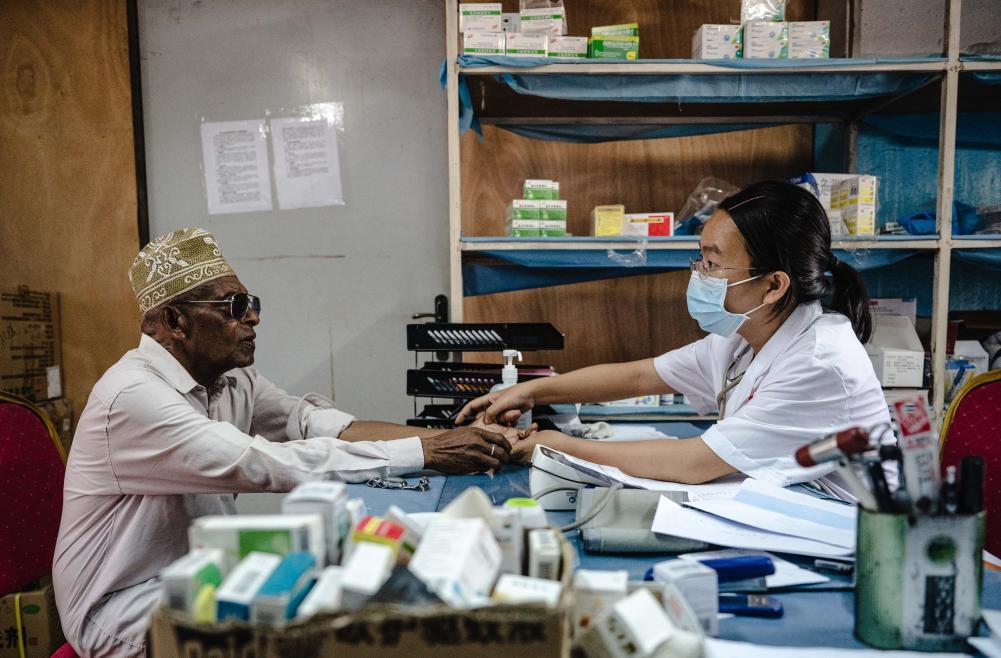 2024年1月11日,中国第15批援科摩罗医疗队队长潘春熹在位于科摩罗首都莫罗尼的马鲁夫医院内为患者看病。新华社记者王冠森摄