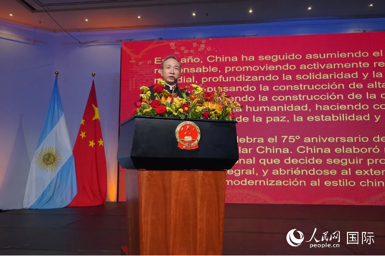 图为中国驻阿根廷大使王卫在招待会上致辞。人民网记者 许放摄