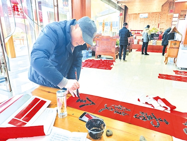 1月14日至15日,随县淮河镇慈云居生态园联合随州市书法家协会共同举办“迎新春、送万福”书写春联惠民公益活动。(随州日报通讯员杜可心摄)