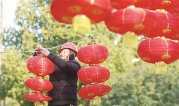 1月17日,龙泉公园门前工人正忙着悬挂红灯笼。随着春节临近,我市城区各条街道被中国结、红灯笼等装扮得红红火火、年味十足。(记者 郑波 摄)