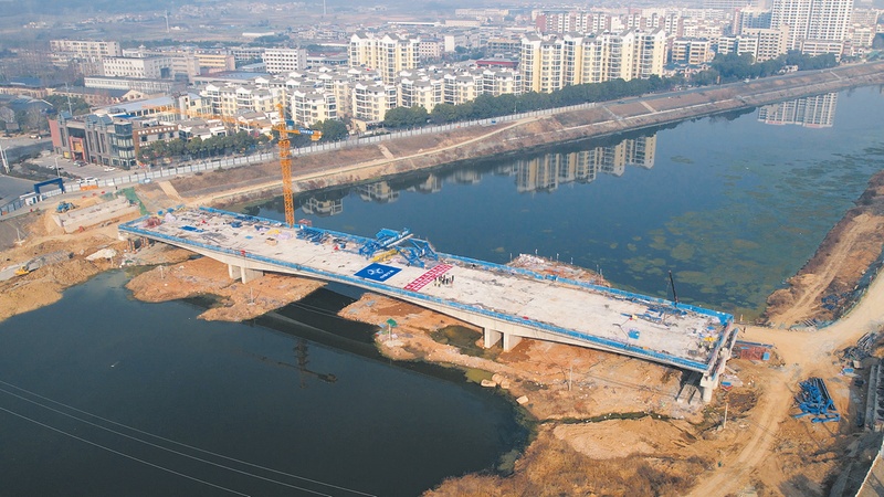 1月18日,随城㵐水二桥拆除重建工程主桥顺利合龙,预计2025年寻根节前通车。 (随州日报全媒记者徐斌摄)