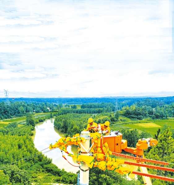 国网随县供电公司带电作业班成员在均川镇解河村进行带电检修