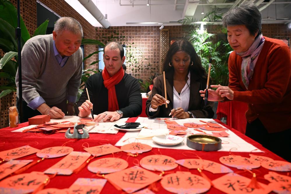 1月17日,外国人在大联欢活动中体验书法。当日,“春暖朝阳·巳巳如意”中外居民大联欢新时代文明实践活动在北京朝阳区左家庄街道举行。新华社记者 金良快 摄